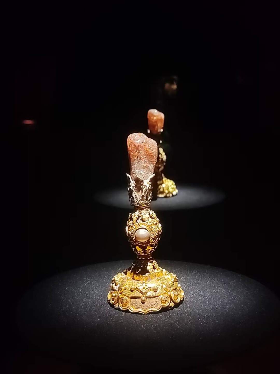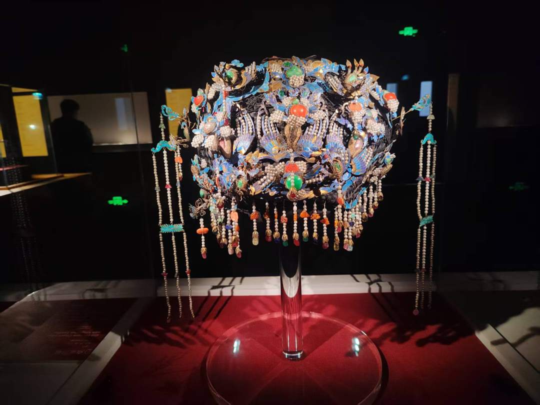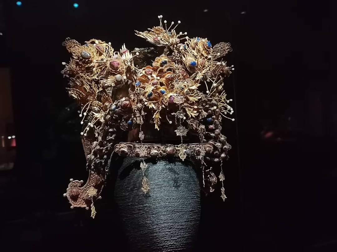 “凝眸”展中,展出了一件400多年的明嘉靖年间的金镶宝累丝五凤冠,也叫五翟金冠,为贵州省博物馆的镇馆之宝之一。这是目前发现的仅次于明定陵皇后凤冠的金冠。它重1388克,主要佩饰由纯金打造,并且镶满了数百颗色宝石,以龙凤为核心进行组合,重重叠叠,花团锦簇。