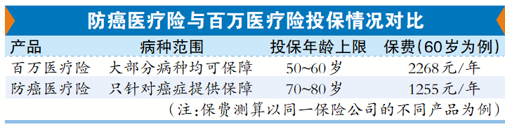 在保费支出方面,防癌医疗险也比百万医疗险更低一些。以某国企保险公司的百万医疗和防癌医疗险为例,被保险人60岁时,防癌医疗险的保费是1255元/年,而百万医疗险是2268元/年。资深保险顾问吕金介绍,“防癌医疗险也比较适合预算有限,希望以更低的保费解决高额的癌症医疗费的人群。”