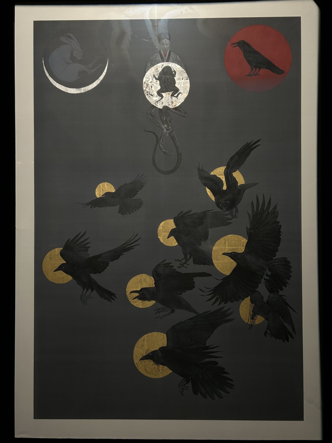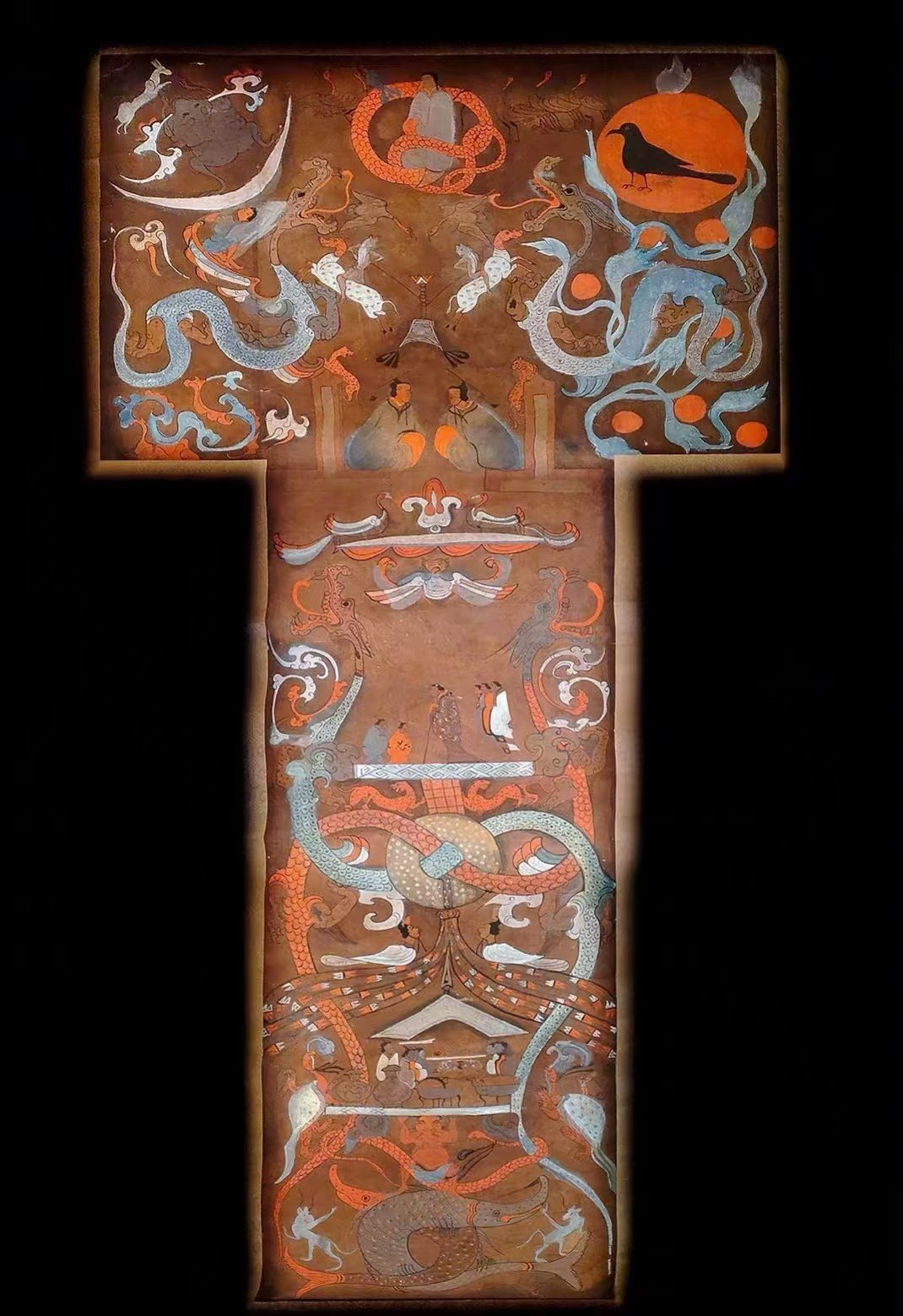 其中在“黑”主题展陈里,讲解员介绍称,中国当代艺术家沈宁作品《世界的梦》有部分元素取材于马王堆一号墓出土的T形帛画,墓主是长沙国丞相利苍之妻辛追。这幅布景壮丽、想象奇特的帛画,也是湖南博物院“镇馆之宝”之一。
