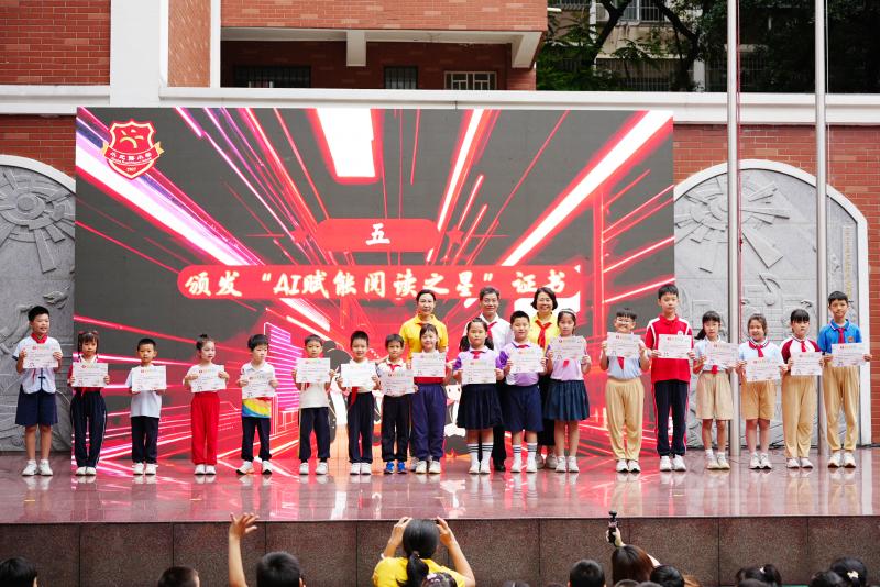在活动中,张忠德为在“阳光少年爱阅读,智创AI新时代”活动中表现突出的小北路小学学生颁发“AI阅读创新之星”证书,观看孩子们将传统阅读与现代科技完美融合的创新成果。