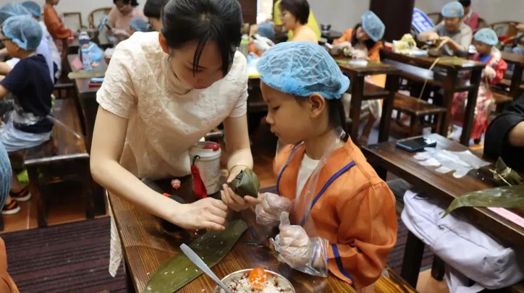 在越秀公园粤秀书院,小朋友和家长们可以一起参与“亲子包粽子”体验活动,现场老师手把手指导包粽子的小窍门。