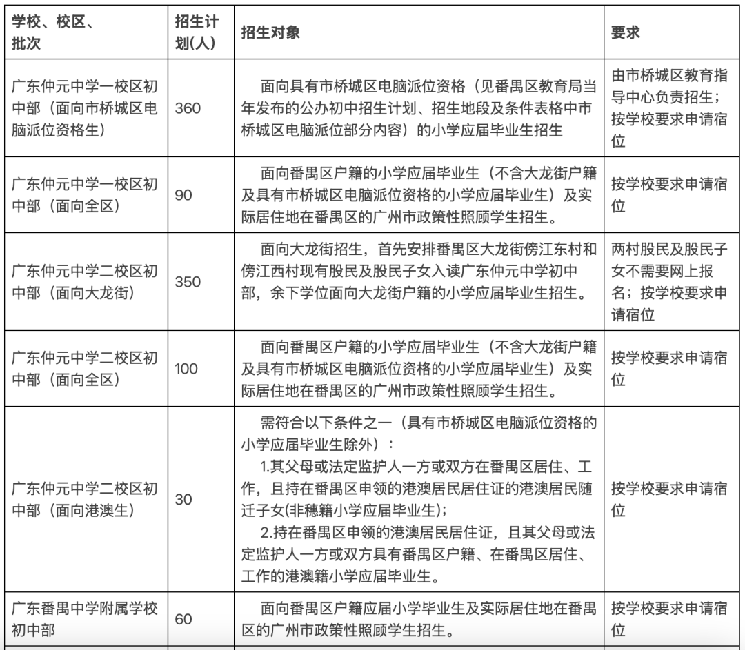 近日,番禺区教育局发布区属初中招生简章,明确广东仲元中学一校区初中部、广东番禺中学附属学校初中部、广东仲元中学附属学校初中部和广东番禺中学实验学校初中部等多所区属初中面向全区或属地镇街招生的计划,招生计划总共为1110人。