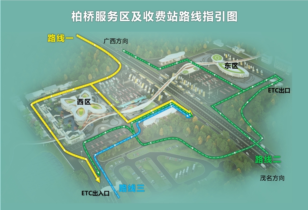 路线3:使用ETC设备的19座以下一、二型客车可从柏桥收费站进入柏桥服务区(西区),然后从西区匝道进入高速公路主线(往茂名方向),但禁止从联络通道去往服务区东区。