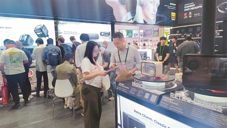 广州市海珠区纪委监委工作人员在广交会现场向25家海珠区参展企业派发海珠区暖企执法监督小程序操作指引。