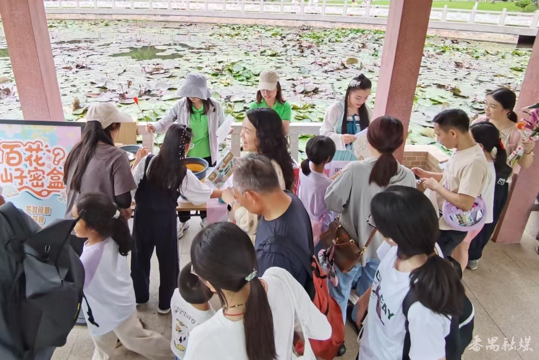 景区内,限定版“百花仙子密盒”成为游客打卡热点。“百花仙子”携“花花密盒”闪现莲花仙境和百花园,游客通过植物谜题、诗词接龙等互动环节赢取纪念品,在花香中沉浸式体验“文化游园闯关”。