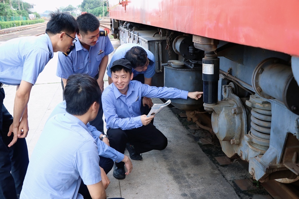 5月28日清晨,三水整备场的薄雾还未散尽,张力已屈膝半跪在钢轨旁,检车锤与车轮的清脆碰撞惊起几只麻雀。深蓝色制服后背洇出的盐霜,无声诉说着端午节前货运高峰的繁忙。“因为站货场位置不同,且分布较广,我们小运转司机还需要频繁更换司机室操纵机车,每次到站停车,必须下车仔细检查机车走行部,确保机车状态良好。”他一边对副司机讲解,一边细致检查着机车——大到柴油机、制动系统,小到螺丝、指示灯。泛黄的司机手账摊在操纵台上,内页手绘的关键信号机位置、坡道限速等细节标注被晨风掀起。他耗时数月熟悉掌握,如今已将运行区段关键项点深深印在脑海里。