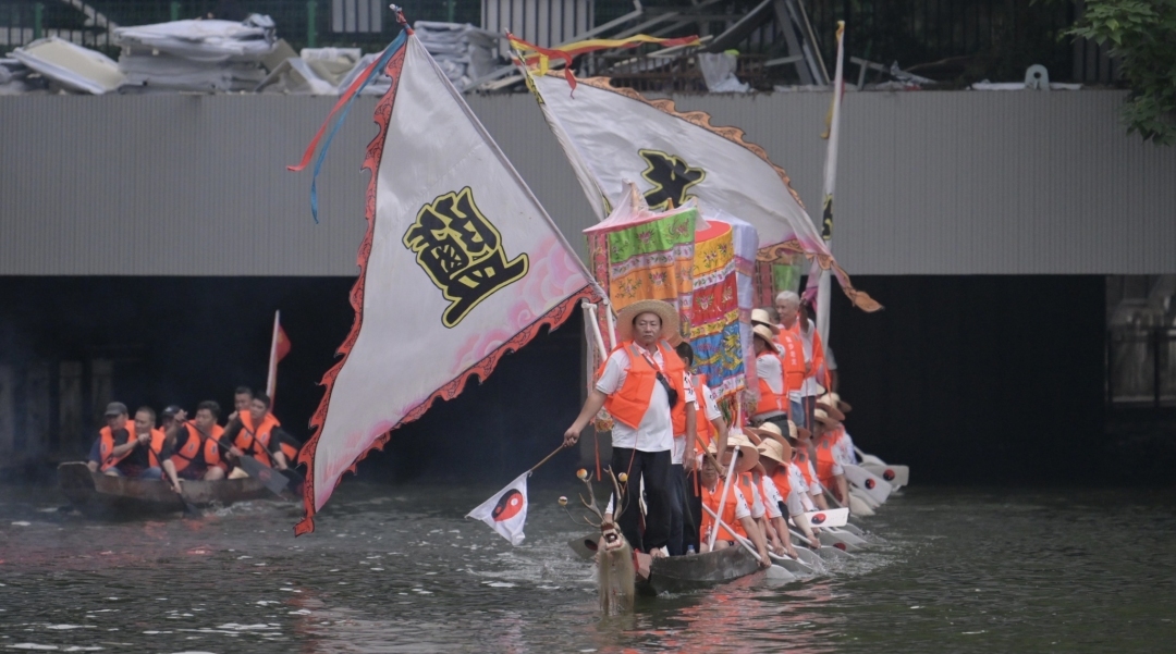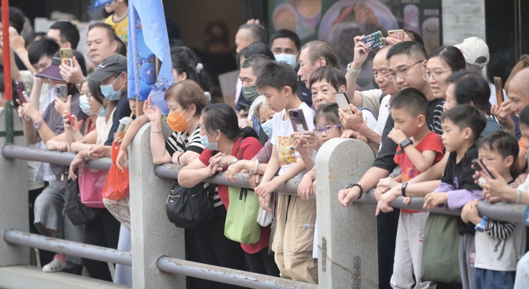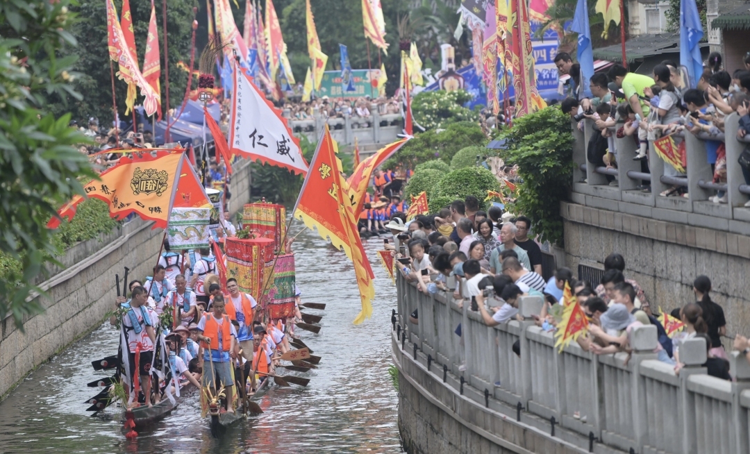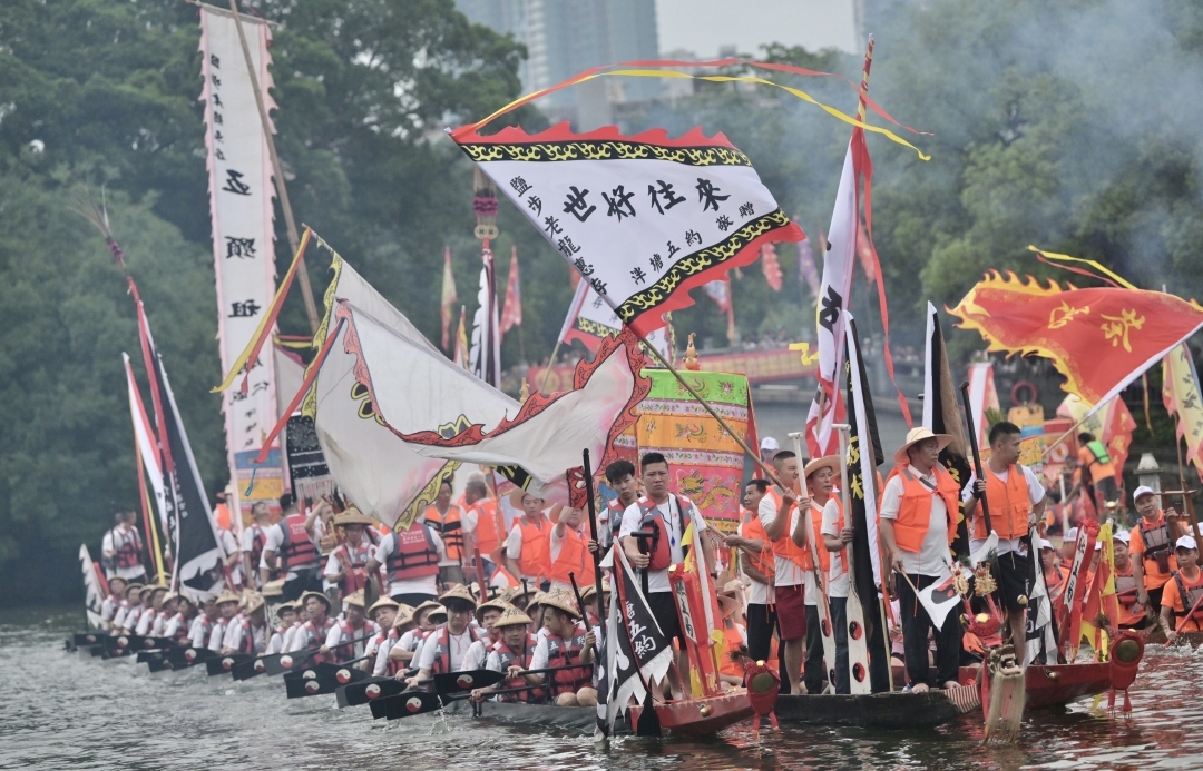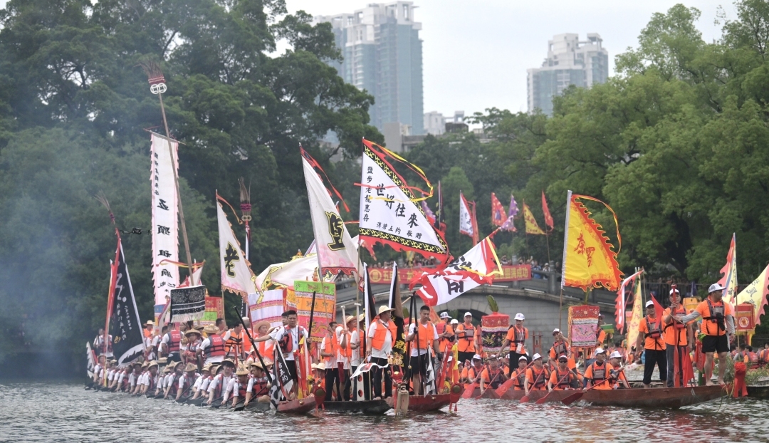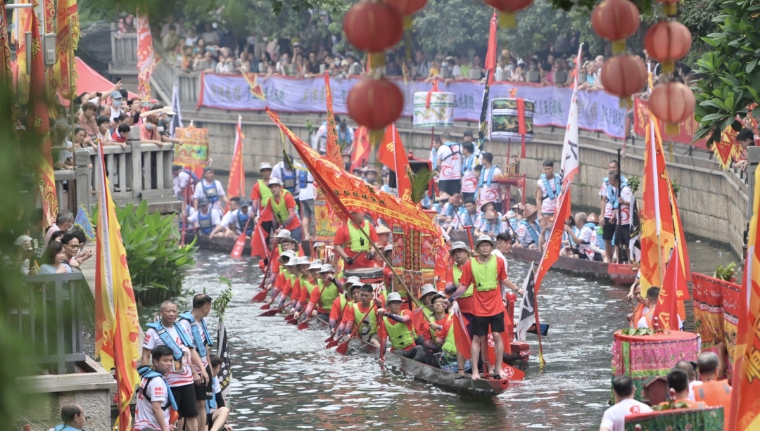 5月31日,广州荔湾区荔枝湾,全国最古老的龙船593岁盐步老龙来探望“契仔”——400多岁的泮塘老龙,延续400多年的龙舟结契传统。当天前来做客的还有石井大冈、坑口、茶滘等广佛17支兄弟村龙船。随后,盐步老龙、泮塘老龙等25艘龙船巡游荔枝湾,再现岭南水乡以船会友的盛况。