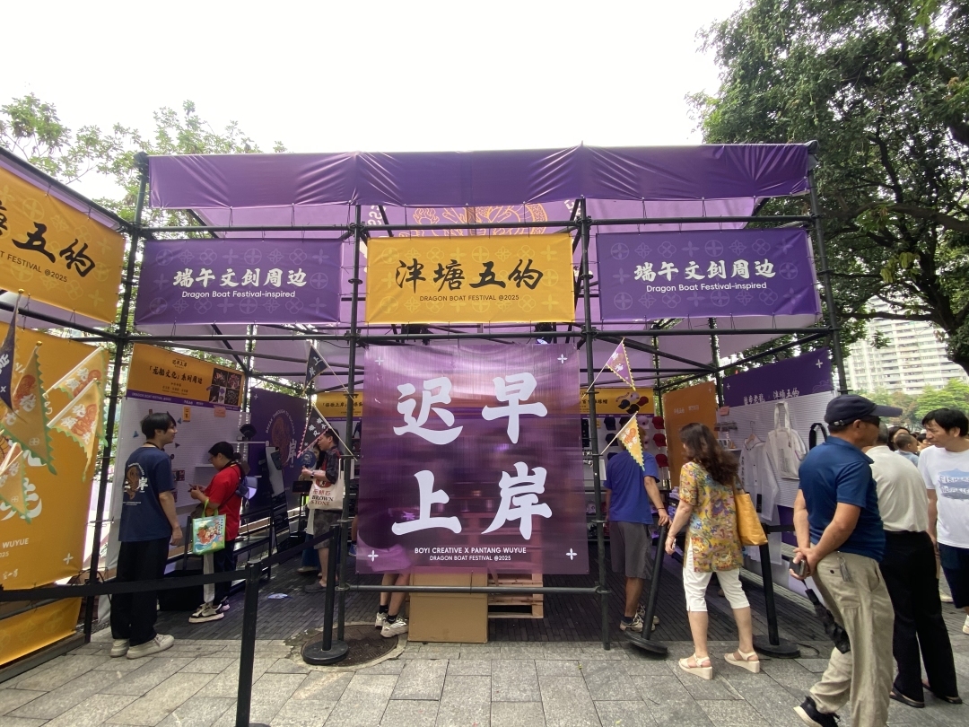 当天,老龙会面、群龙巡游,将荔枝湾“五月五 龙船鼓”系列活动推向高潮。随着龙舟文化、龙舟经济越来越热,今年的泮塘龙船景还有些新意思。水上,锣鼓声声,岸上人头涌动。一家以“上岸”为主题的龙舟文创铺吸引人们的注意。泮塘“饮胜”龙船鼓造型的纯手工陶艺杯,“上岸”主题T恤、帽子、包包、冰箱贴,以及龙船桨造型的折扇……吸引人们纷纷选购。