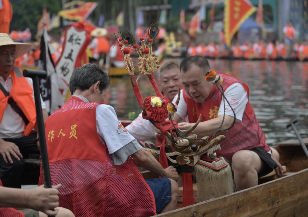 上午9时许,锣鼓声声中,白须的盐步老龙在荔湾湖隆重登场。“契爷到!各位招呼好乡亲!”伴着炮仗的热烈欢迎,五秀埠头,众多等候多时的泮塘乡亲忙活起来。泮塘乡亲向盐步老龙拱手作揖,赠送写着“昔日夺标同鼎甲,当年沧海占群龙”的香云纱标旗,德高望重的长者为盐步老龙龙头簪花褂红。