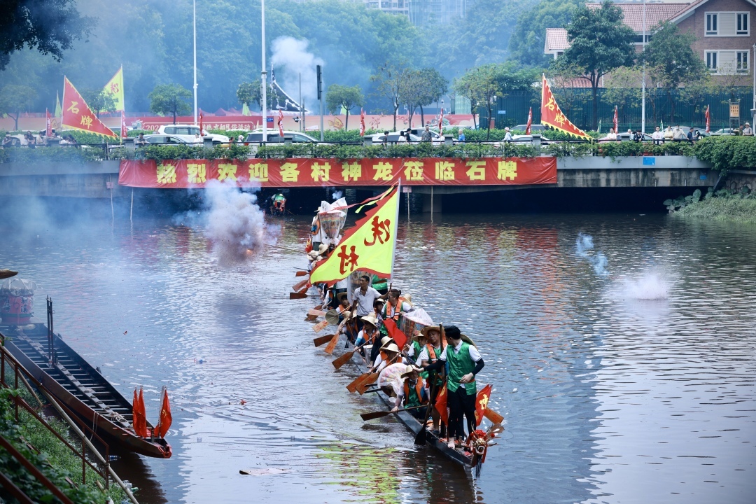 农历五月初五,是中国传统节日端午节。石牌新涌迎来了一年一度的龙船招景,近百艘来自天河猎德、海珠琶洲、黄埔文冲等地的龙舟泛浆而来。呐喊声、鞭炮声、锣鼓声交织在一起,“睇龙船”“扒龙船”“食龙船饭”,热热闹闹的氛围里蕴藏着村民对乡土的深深眷恋。