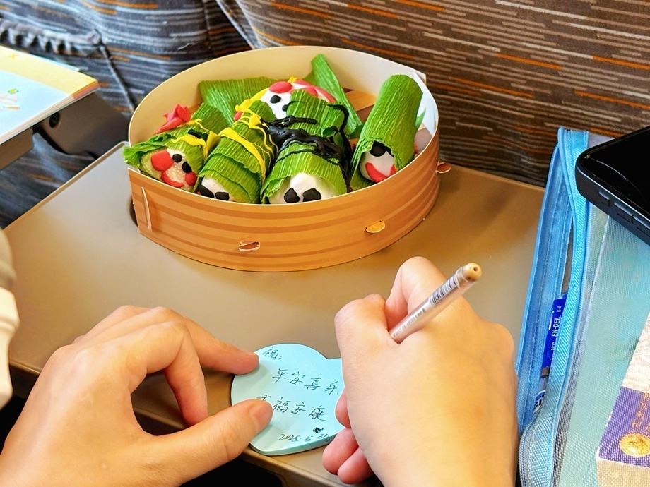 列车员肖钰佳递上“心”形便利贴时,餐车正飘来阵阵香气,广铁悦享动车餐饮公司推出的端午特色餐食同步上线,餐车吧台陈列展示着风味肉粽、金丝蜜枣粽等口味丰富的粽子。活动当日,餐车为购买现制饮品的旅客随赠粽子一枚,向旅客传递着端午安康的美好祝愿。