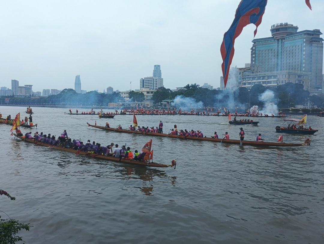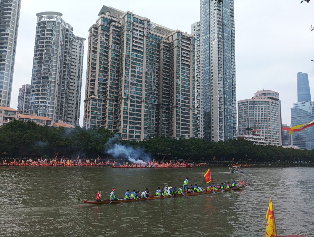 鞭炮持续,飞龙穿梭,这就是端午节当天广州市中心二沙涌上的寺右景、二沙景。五月初五,越秀区相邻的寺右、二沙都有龙船景,吸引了众多市民前往珠江水道二沙涌两岸的五羊新城、二沙岛观赏。