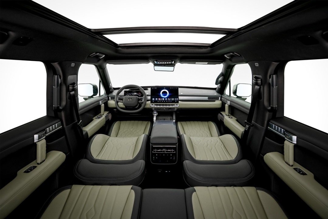 猛士M817的车身尺寸5100×1998×(1899-1919)mm,轴距3005mm,空簧版地库模式可降低45mm。主副驾座椅靠背放倒,可与后排座垫衔接成1.7米标准双床,第二排座椅完全放平后,与行李箱地毯形成超2.1米的舒享大床,0.9米的成床高度让成年男子可轻松坐立,午间小憩或露营夜宿都很舒适。后备厢容积828L(最大拓展2112L),支持固定网扣与大型装备收纳。车顶可拆装机库搭载“东方鹰眼”车载无人机系统,实现零空间侵占与车内一键操控,解决传统越野装备痛点。