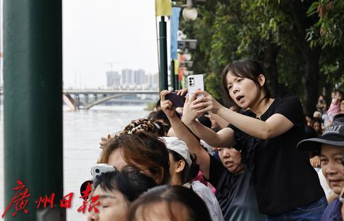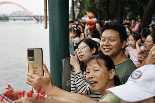 下午3时整,龙舟破浪而出,水面浪花飞溅,岸边观众掌声、呐喊声不断。不少居民驻足观赏、拍照打卡,江边早早围满了人群。