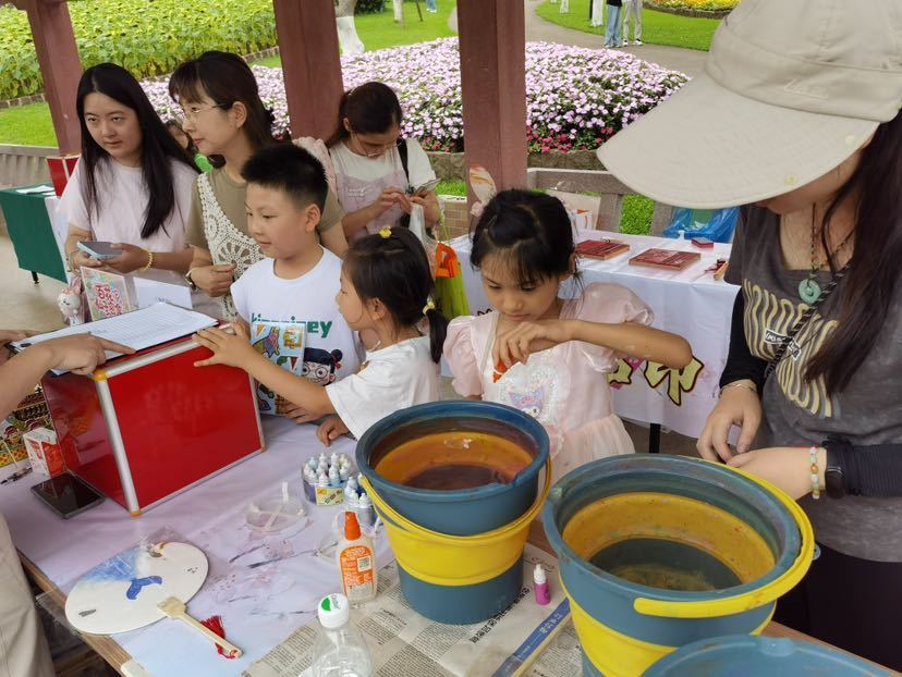 端午节假期首日,百花园连廊里热闹非凡,这里在端午节假期开设的非遗工坊成为亲子家庭的热门打卡地。活动现场设置多个主题体验区,投壶竞技重现汉代礼乐风雅,古法拓印传递文化自信,亲子家庭还可亲手制作漆扇、龙舟拼图等非遗文创,带走专属文化记忆。同步推出的非遗材料包也备受欢迎。