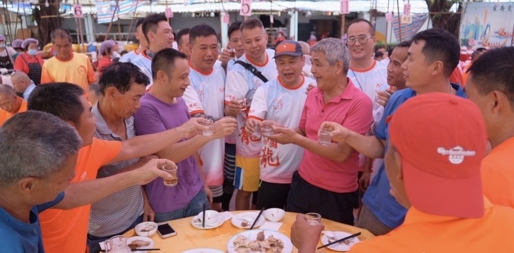 远道而来的扒仔们吃罢点心稍作休整,很快又被盛情邀请入席品尝这最具端午特色的龙船饭。龙船饭是端午节期间的重要环节,它不仅是对划手们的犒劳,更是全村人团圆的象征。脆皮烧猪讨个好意头,而龙船丁最初就是为了犒劳舵手、划手、鼓手,虾米、鸡蛋、香菇切丁,配以豆角粒、辣椒圈、咸萝卜、花生粒炒制,以祛水中湿气。如今的龙船饭已发展为全村盛宴,男女老少齐聚一堂,三五百围同时开席,共祝亲友端午安康。
