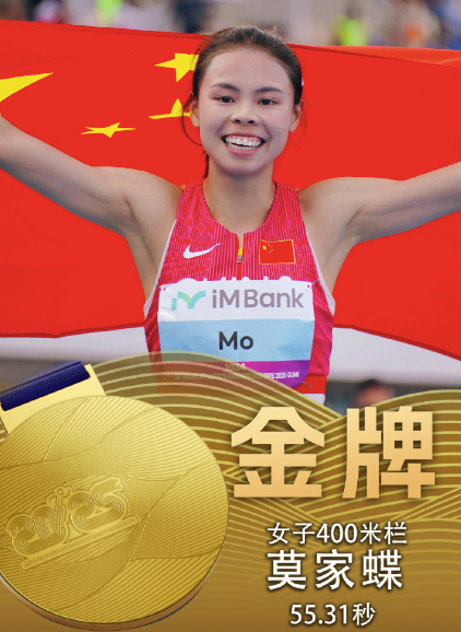 为期5天的2025年亚洲田径锦标赛31日晚上在韩国庆尚道龟尾体育场结束了全部比赛,在收官日里,中国田径健儿收金势头不减,4枚金牌全部来自径赛项目,而且都是由女将们夺得,即女子200米、女子400米栏、女子4✖️100米接力和女子800米,其中莫家蝶在女子400米栏和吴洪娇在女子800米决赛中均最后时刻完成反超夺冠。