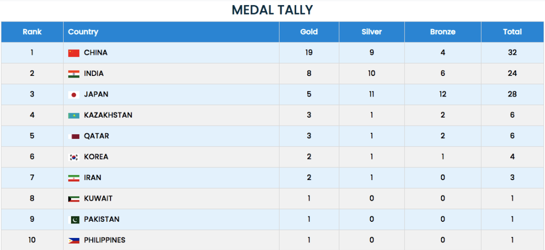 至此,本届亚锦赛中国队共斩获19枚金牌,高居金牌榜首,印度队和日本队分别获得8枚金牌和5枚金牌位居金牌榜第二、三名。这也是在2017年、2019年和2023年连续三届亚锦赛都与金牌榜首无缘后,中国队终于又重回亚锦赛金牌榜首。本届亚锦赛上,共有10支参赛队有金牌进账,中国队是唯一金牌数过双的,科威特队、巴基斯坦队和菲律宾都只有1枚金牌。