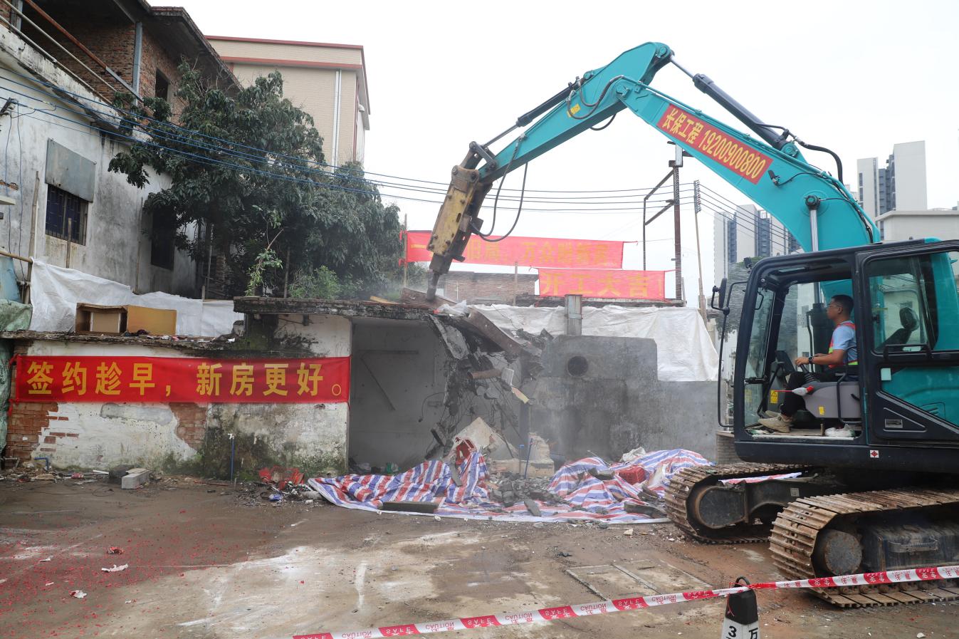 5月30日上午,广州市南沙区港湾街道在东井村、南横村组织开展街道城中村改造建设指挥部暨城中村改造项目“百日攻坚·首拆促签”工作现场会,敲下签约拆除“第一锤”。