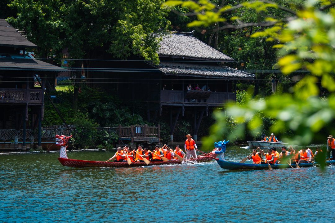 下午的龙舟赛更是掀起了活动高潮,现场游客们积极按活动要求现场报名体验龙舟竞渡,宽阔湖面上两艘龙舟如离弦之箭,水岸两侧欢呼声、掌声此起彼伏震耳欲聋,参赛队伍在“嘿哟嘿哟”的整齐号子中劈波斩浪,桨影翻飞,畅享刺激与欢乐。