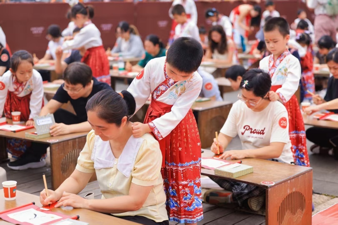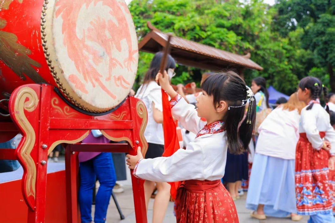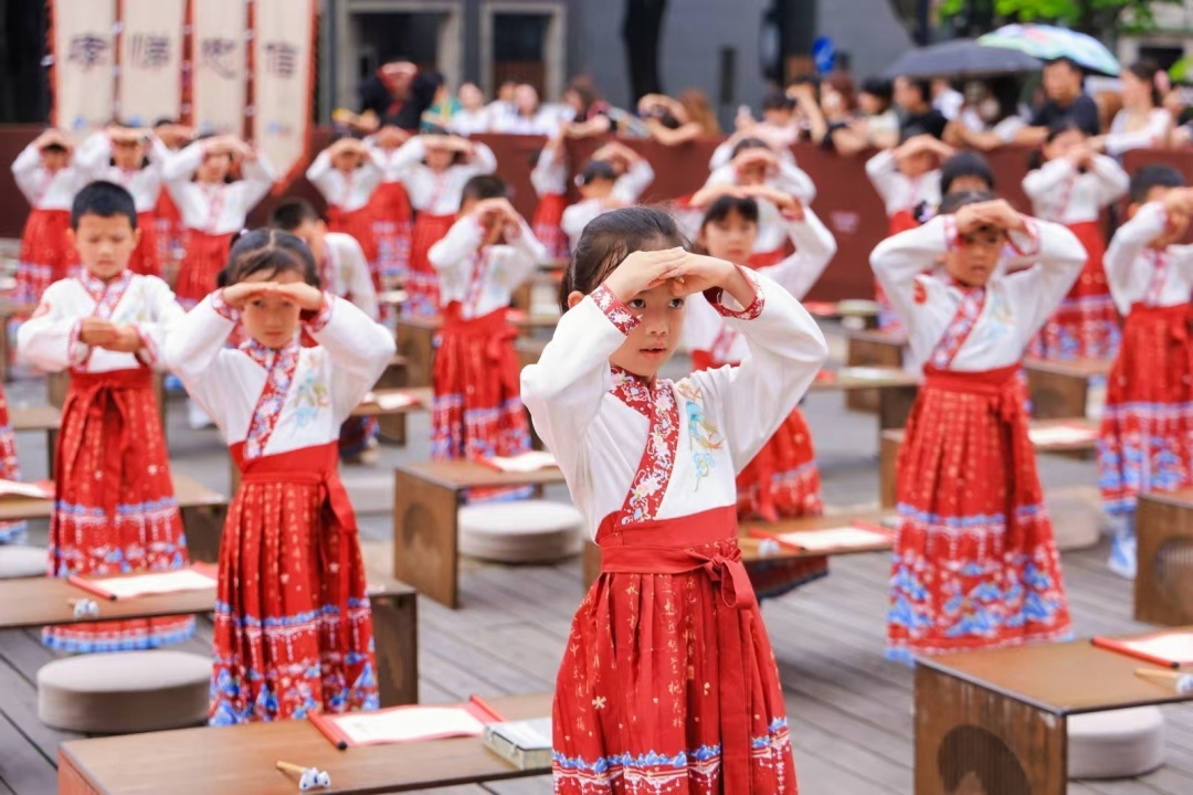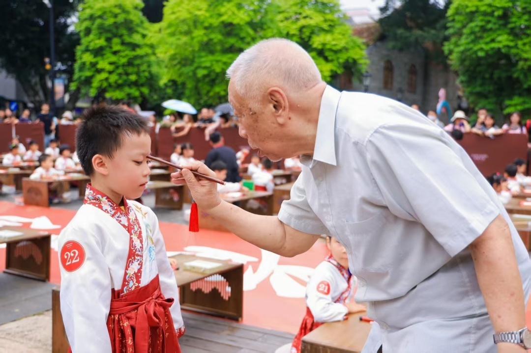 佛山自古崇文重教,岭南天地依托祖庙的千年文脉底蕴,致力于传承中华优秀传统文化。6月1日儿童节当天,百位适龄学童身穿汉服,相聚岭南天地鲤鱼广场,完整体验开笔礼仪式,岭南天地更特邀原佛山大学教授、学者余福智先生为学童点朱砂开智。眉间一点朱砂,唤醒学童对知识的敬畏,手执毛笔写下“人”字,领悟“为学先为人”的深刻道理。开笔礼作为中国古代重要的启蒙仪式,其雏形可追溯至春秋时期的“束脩之礼”。自明清以来,佛山因商贸兴盛、文风昌盛,开笔礼逐渐发展为学童入学前的庄重仪式。整套流程包含正衣冠、跨状元桥、拜谒先师、诵读经典、击鼓明志、启蒙描红、朱砂启智等环节,寓意“以礼启智,以德树人”,承载着家族对子弟修身治学的期许。如今,开笔礼在传承中被赋予新内涵。岭南天地通过招募学童集体参与,重现传统礼序,既延续敬拜先师、启智明志的核心精神,亦融入亲子体验等现代设计,将百人开笔礼打造为连接古今的文化纽带,让传统文化在当代生活中焕发新生。