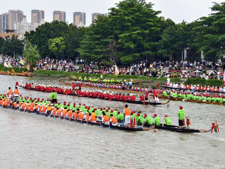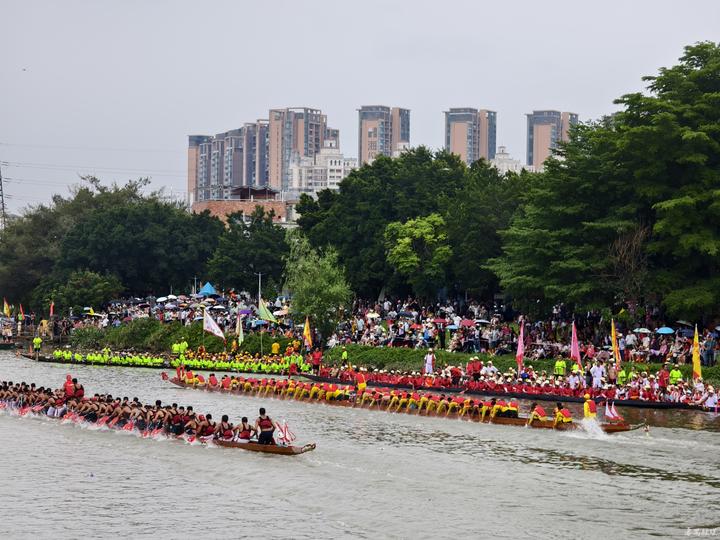 6月2日,农历五月初七,番禺“十乡龙船会”之北海景在番禺市桥水道市桥三桥至大富村水域展开,与此同时,市桥水道南岸的龙船会也在这段水域上演渡头景,水面上共汇聚了九十多艘龙舟巡游和竞渡,吸引沿岸上万名市民群众观看。