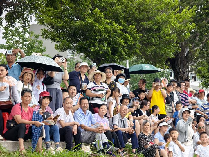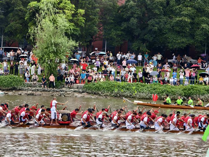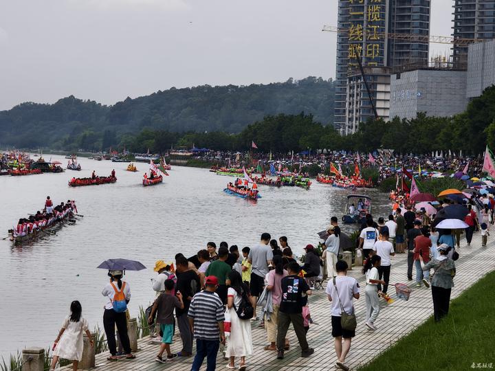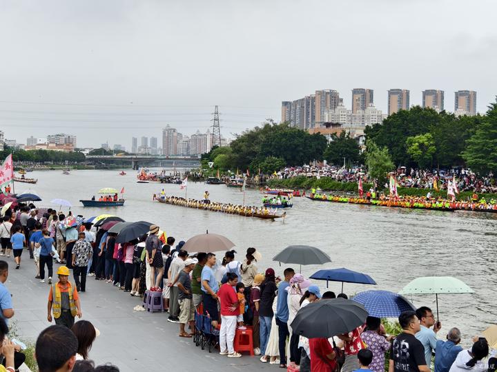 岸上,市民的热情被彻底点燃,欢呼声、鼓掌声、加油声交织在一起。围观的人群中,有的家庭全员出动,家长抱着孩子,年轻人在一旁兴奋地呐喊;有的三五成群,一边观看,一边热烈地讨论着。来自附近北海村的梁女士早有准备,近水楼台先得月,她说上午10时多就来到现场,物色到一个视野绝佳的位置“安营扎寨”。“我每年都来,就喜欢这热闹的氛围,今天可不能错过。”梁女士笑着说。“水面龙舟汇聚,岸上人山人海,太热闹了。”来自石碁镇大刀村的一位女士兴奋地说,她听朋友介绍后特意带家人赶来看赛龙舟的。住在市桥街沙墟一村的王先生感慨地说:“今天是端午假期的最后一天,带孩子来看龙舟,让孩子感受一下番禺的龙舟文化。”