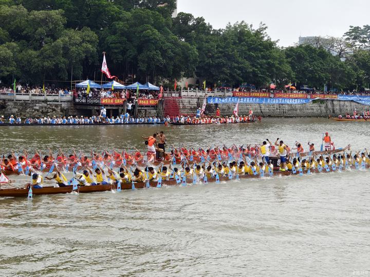 市桥水道,波涛拍岸,一艘艘插着缤纷彩旗的龙舟在市桥三桥至大富村之间的水域来回穿梭。有的龙舟以两艘一组展开激烈的竞速角逐,有的三艘并排巡游。参加竞渡的龙舟上,龙舟手们双手紧握船桨,整齐而有力地划动着,溅起高高的水花;鼓手们更是全情投入,弓着腰,双手如雨点般敲击着鼓面,鼓声“咚咚”作响。