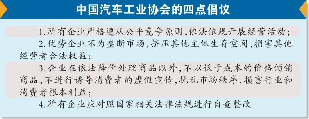 中国汽车工业协会5月31日在《关于维护公平竞争秩序促进行业健康发展的倡议》中提到,倡议所有企业严格遵循公平竞争原则,依法依规开展经营活动;优势企业不能为垄断市场,挤压其他主体生存空间,损害其他经营者合法权益等。协会矛头直指“价格战”,称:“以无序‘价格战’为主要表现形式的‘内卷式’竞争,是行业效益下降的重要因素。”