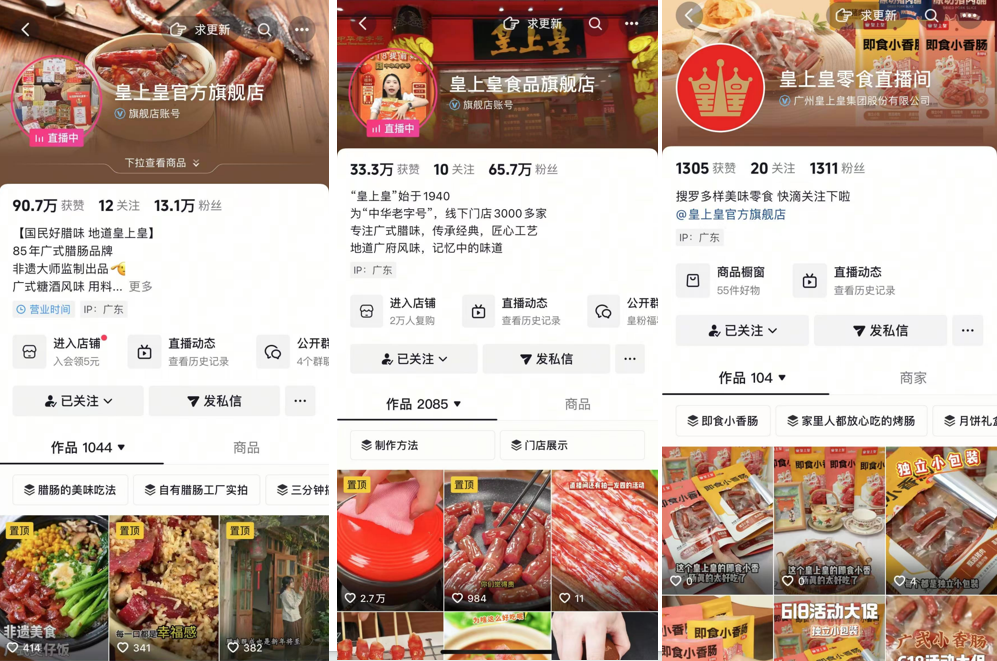 面对抖音电商的多元用户生态,皇上皇以矩阵化账号构建起立体市场,目前已建立@皇上皇官方旗舰店、@皇上皇食品旗舰店、@皇上皇干货旗舰店优选号、@皇上皇零食直播间 等多个抖音账号。官方旗舰店作为品牌形象主阵地,主打“文化种草”,具有地方特色的西关大屋、骑楼的直播场景里,主播化身“广府美食推广大使”;食品旗舰店则瞄准中老年客群,延续线下熟悉的“大规格包装+节庆礼盒”模式;零食直播间则聚焦Z世代,以即食小腊肠和自热煲仔饭为拳头产品,成功将佐餐腊味转化为办公零食和露营必备。多账号联动下,实现了“地域品牌全国化、老年品牌年轻化”的双重突破。