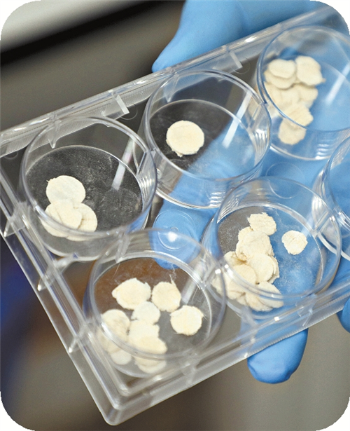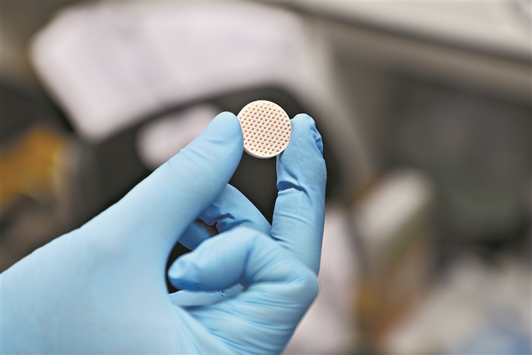 “这些工序做好后,根据受体骨损伤的具体情况,经过切削和各种精细加工,就可以生产出不同形状的莲藕三维支架可降解材料,植入受体体内。”吴钧说。