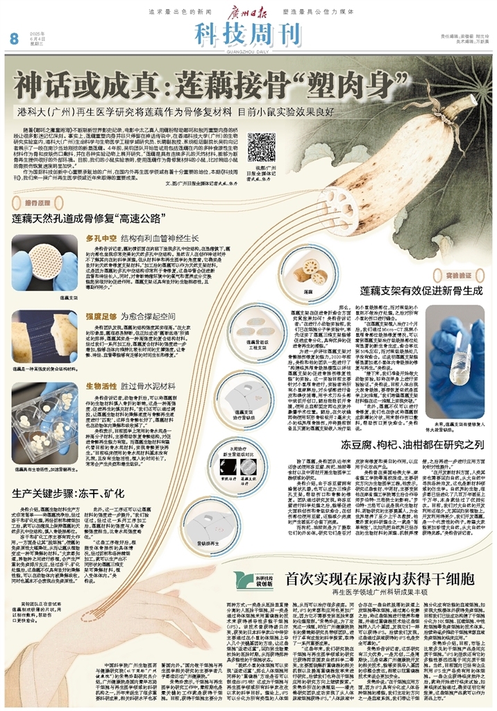 “此外,莲藕不仅可以进行骨修复,我们也在尝试将莲藕制成极薄的片状,用来制作伤口敷料,帮助伤口更快愈合。”吴钧说。
