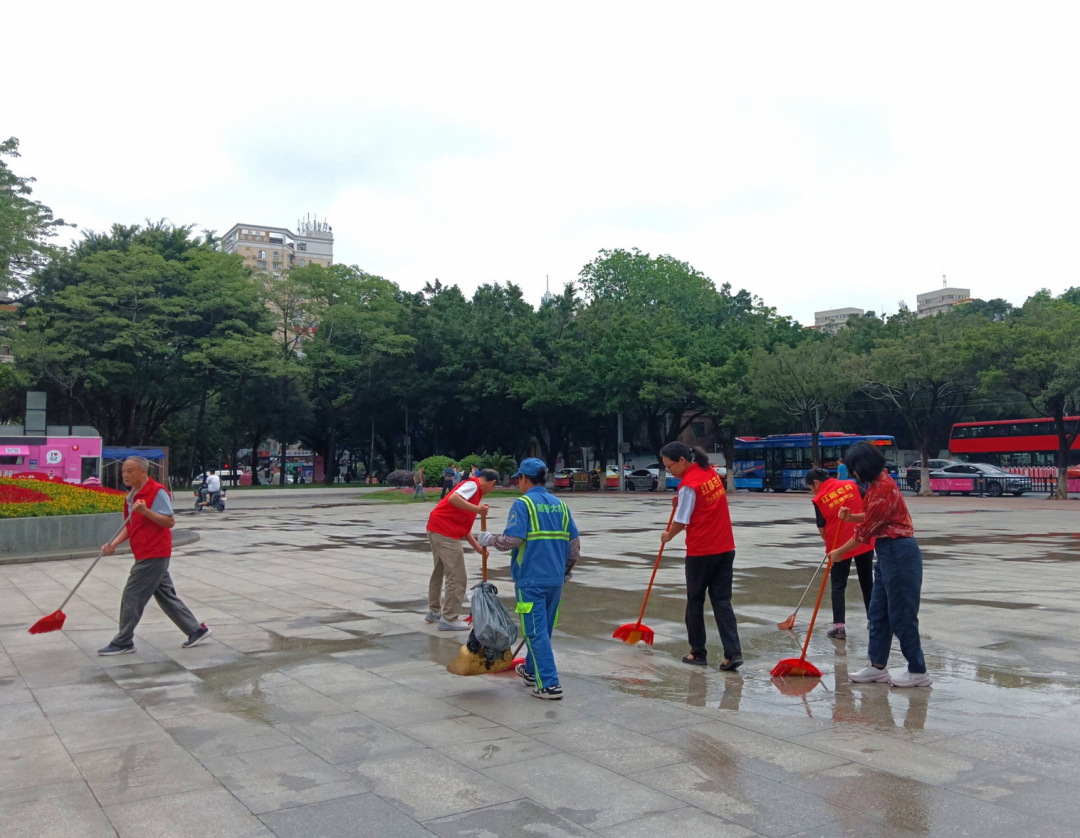 当日上午,红棉老兵志愿者的身影便活跃在广东省人民体育场正门英雄广场处。他们和环卫工人一起分组协作,在开赛前完成广场环境清洁。傍晚赛前,志愿者转至赛场周边各交通路口,引导行人车辆通行,规范整理共享单车及电动自行车停放,维护市容和道路秩序,助力赛事顺利进行。