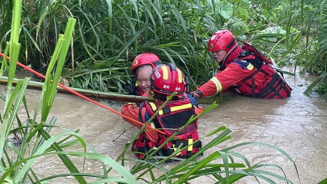 消防救援队伍抵达现场后,经专业侦查发现,强降雨致使农田区域严重积水,水流在田垄间冲刷形成湍急河道,水位持续上涨。被困老人手持雨伞,孤立于河岸草地边缘,四周浊流涌动,随时面临被激流卷走的危险。