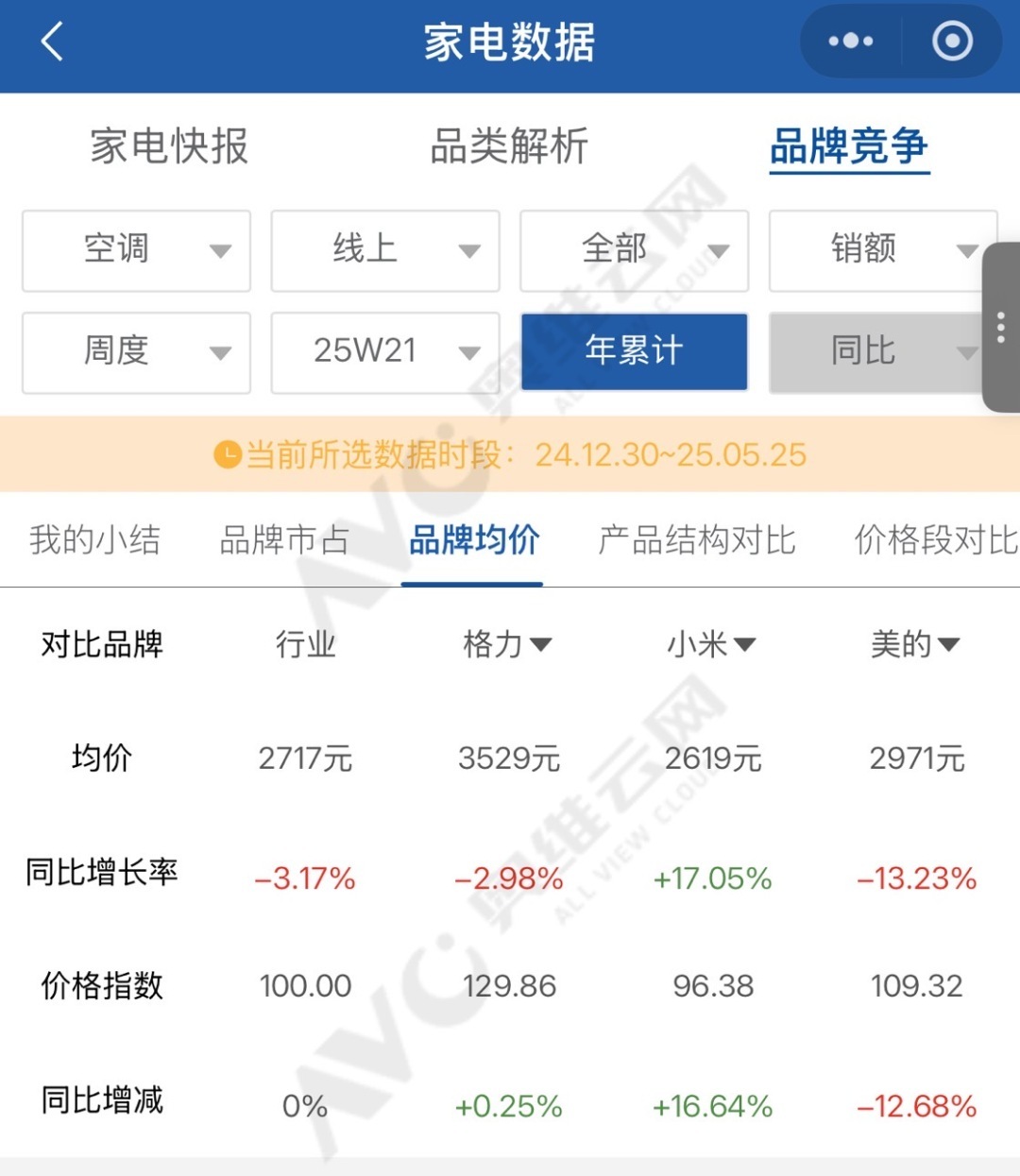 斌科技家电战略研究咨询机构首席研究员张彦斌注意到,今年618,空调价格下降加之“国补”,使得价格更低,特别是一些大品牌也参与其中。“存量市场下,份额竞争显得尤为关键,因此价格成为头部厂商优先考量的策略。”产业经济观察家丁少将表示,小米空调销售额的高速增长引起了企业重视,更多的头部厂商利用子品牌参与价格竞争、巩固市场地位的案例屡见不鲜。奥维云网市场罗盘数据显示,今年以来至5月25日,格力、美的空调品类的线上均价分别下降2.98%、13.23%,而小米空调的线上均价同比增长17.05%。