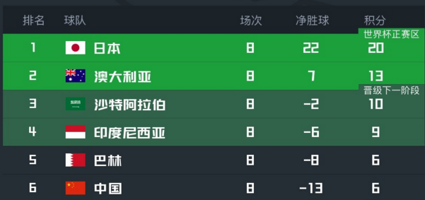 在3月接连不敌沙特队和澳大利亚队后,中国队失去了以小组前两名直接晋级世界杯的机会,目前排名小组最后一位。