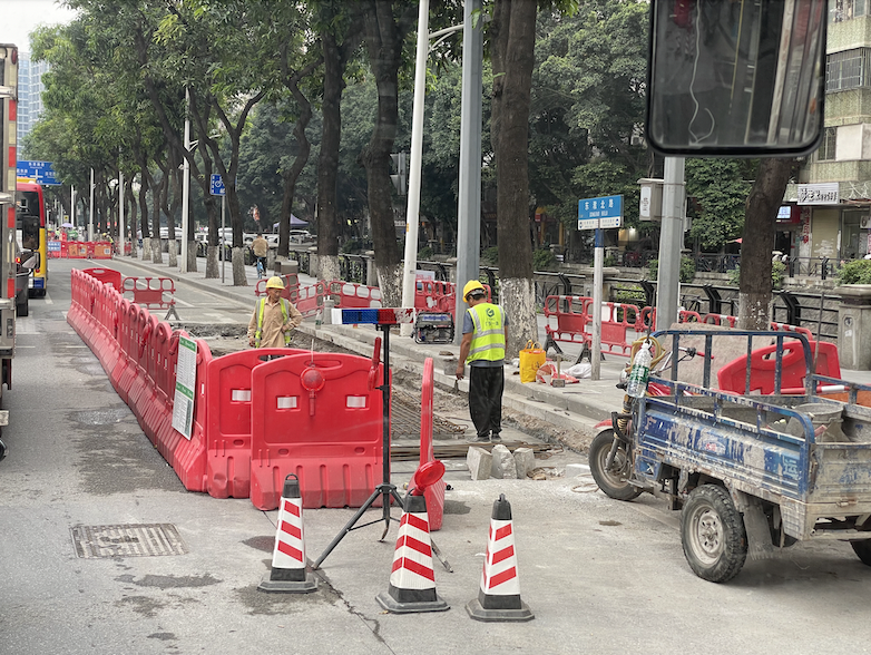 现场,施工人员正在对安全岛进行围蔽施工,设置有红色的护栏,人行道原有铺装已被开挖,施工人员正在对铺装进行更换,现场设置有施工告示牌,交通协管员指挥交通。