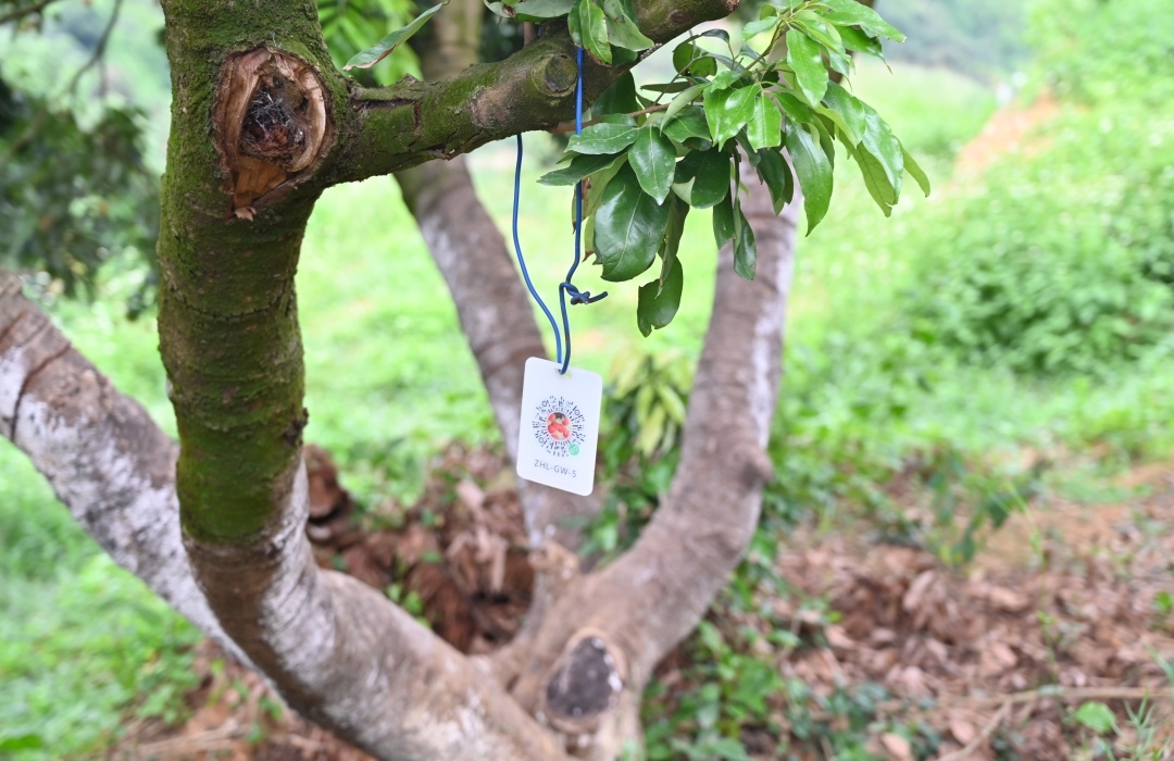 距离电白“仙桃荔”果园70公里外的高州曹江镇华坑村,一片绿野山林中,有一个果园格外引人注意:整齐平坦的山路蜿蜒而上,不同品种的果树错落有致,不少树干上挂着二维码、系着实验标识卡,园内还建有气象监测设备。果园管理办公室门外停放着两台农用机器,墙上的“华南农业大学永根科技站”的金色牌匾格外引人注目。这里正是华农园艺学院教授陈厚彬团队在高州的驻扎服务站点。