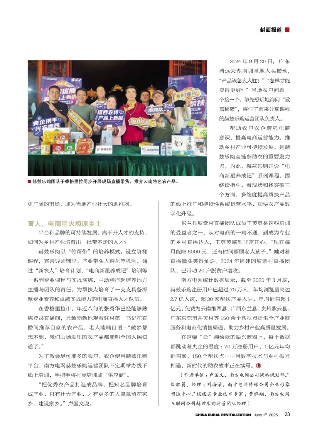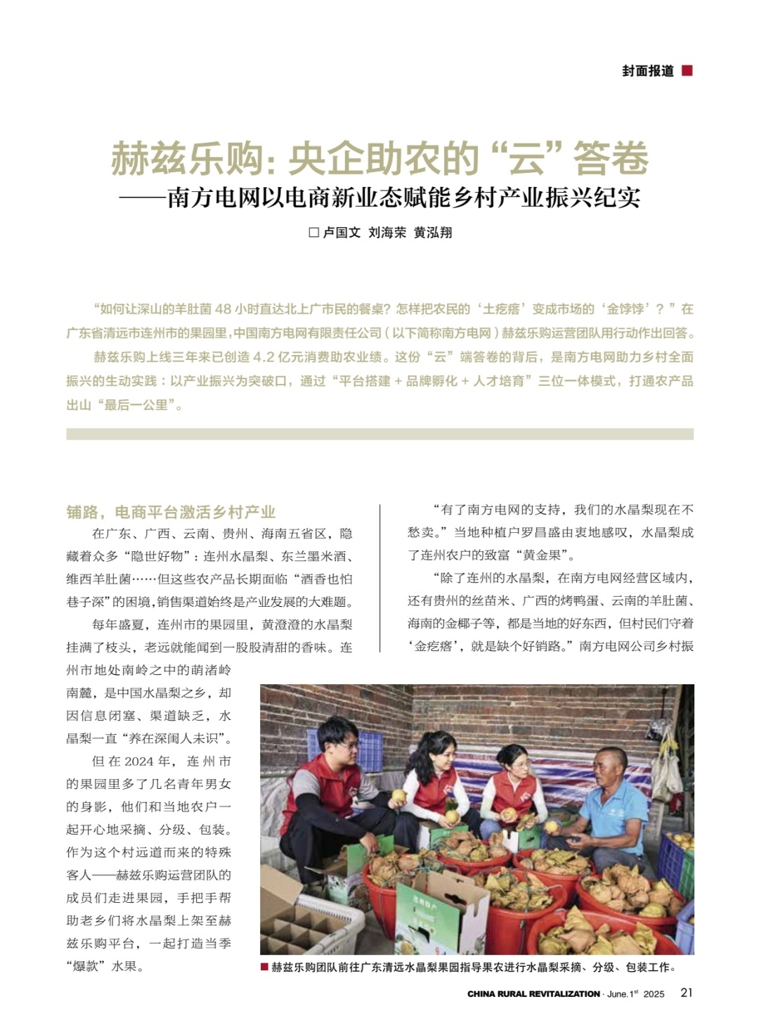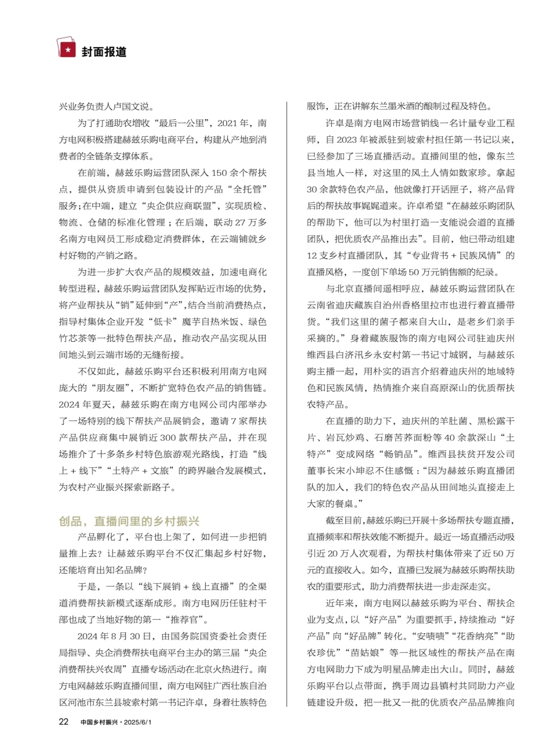 近日,聚焦南方电网互联网服务有限公司赫兹乐购运营团队乡村振兴工作成果的专题文章《赫兹乐购:央企助农的“云”答卷》获《中国乡村振兴》杂志2025年6月刊封面报道,引发广泛关注。