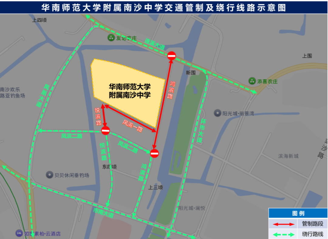 高考期间将对鸿滨路(连溪大道-凤滨二路)双向、凤滨一路(鸿滨路-悦滨路)双向、悦滨路(凤滨一路-凤滨二路)双向实施交通管制,过往车辆建议经市南大道绕行,具体绕行建议如下: