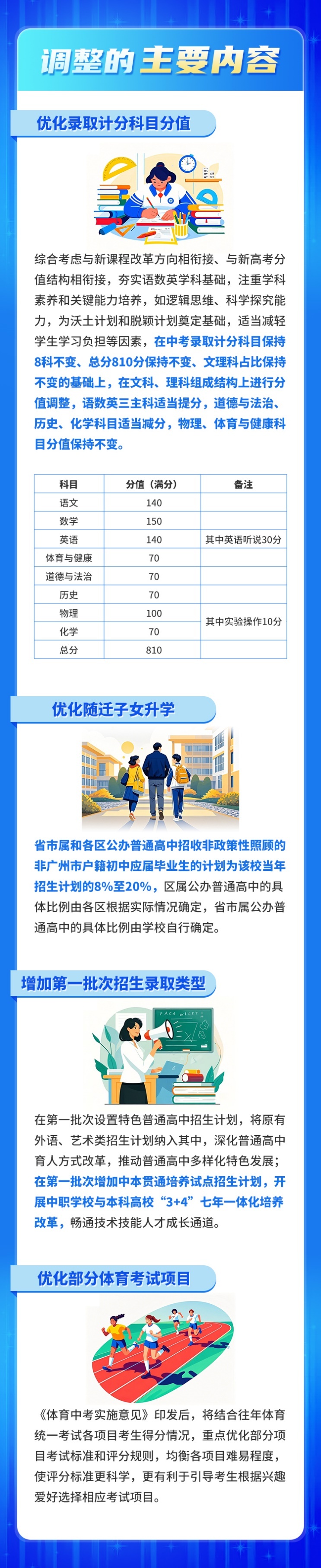 据悉,调整的主要内容包括优化录取计分科目分值、优化随迁子女升学、增加第一批次招生录取类型、优化部分体育考试项目。其中,数学分值从120分升至150分,语文、英语分别从120分升至140分,道德与法治、历史分值从90分降低为70分;化学分值从100分降低为70分。中考满分为810分,保持不变。中考第一批次增加中本贯通培养试点招生计划。