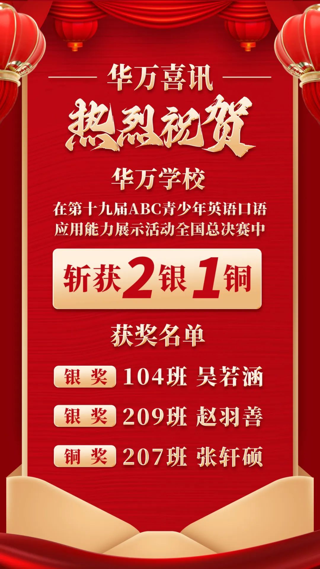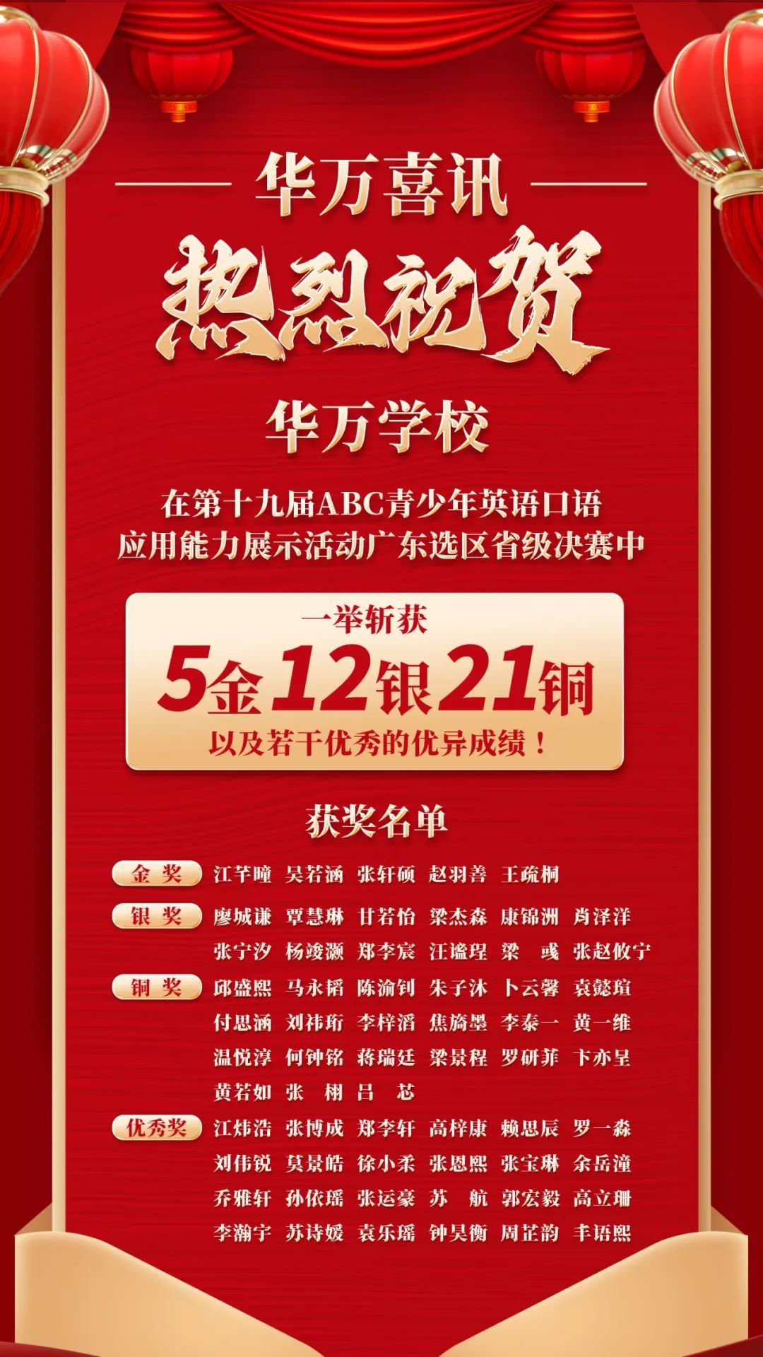 英语奖项:ABC全国英语口语大赛国赛荣获2银1铜奖项、省赛荣获5金12银21铜奖项。