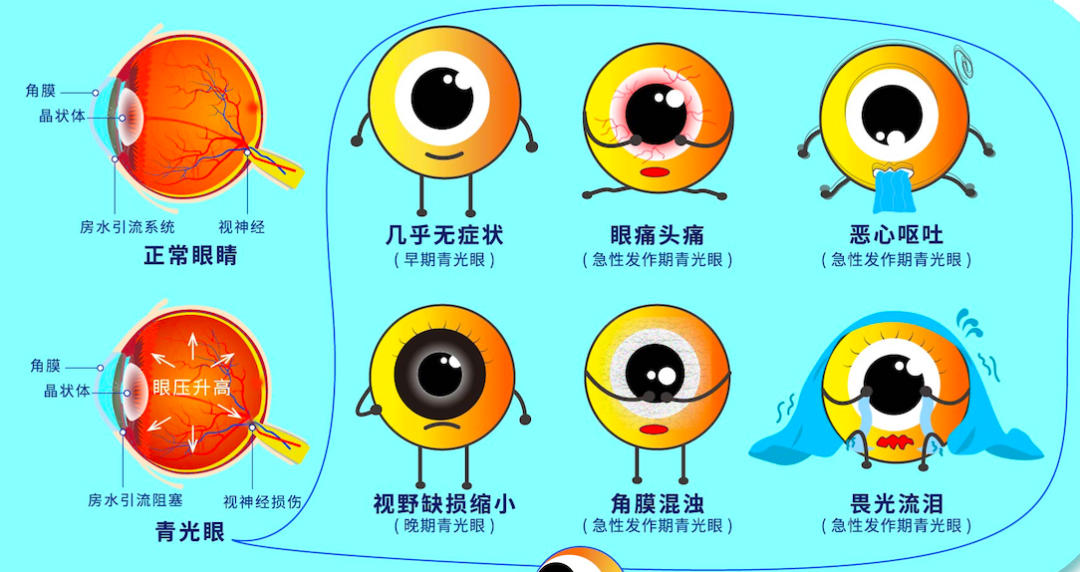 青光眼早期症状不明显,会悄无声息地偷走视力,等发现时已造成不可挽回的损伤,因此被称为“视力小偷”。青光眼急性发作时,伴剧烈眼痛、头痛、恶心、呕吐,可能有视力下降、虹视、畏光等症状。
