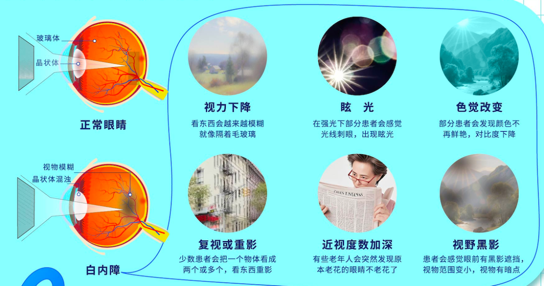 白内障是全球首位的致盲性眼病,老年性白内障是其最常见的类型,我国60~89岁人群白内障发病率约80% 。白内障患者可能会有视力下降、眩光、看东西重影、色觉改变、近视度数加深等症状。