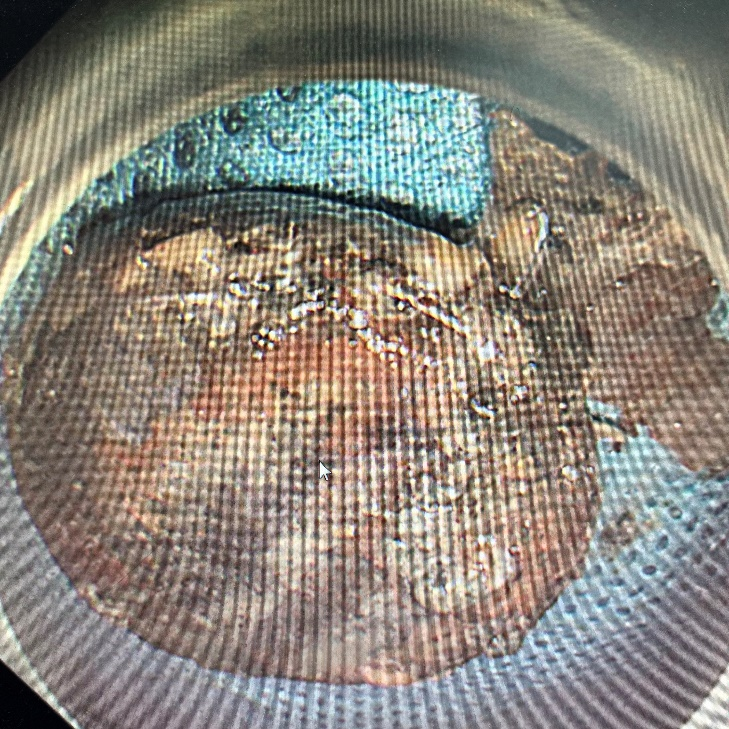 完善术前准备,消化内科唐银丽医生为患儿进行了胃镜检查,电池的周围已出现组织的水肿及局部的灼伤破溃,但所幸未发现食管穿孔。经过仔细分离,电池被顺利取出。
