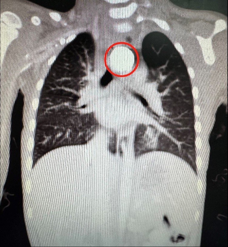4岁的小雨(化名)因好奇吞了一枚纽扣电池,家人并未发现。第三天,小雨突发呕吐及发热,被送到当地医院。影像检查发现电池卡在食管胸上段,紧邻气管和主动脉。家人这才想起,其实小雨从三天前就已经开始一直不明原因哭闹了,推测误吞纽扣电池应该发生在三天以前。