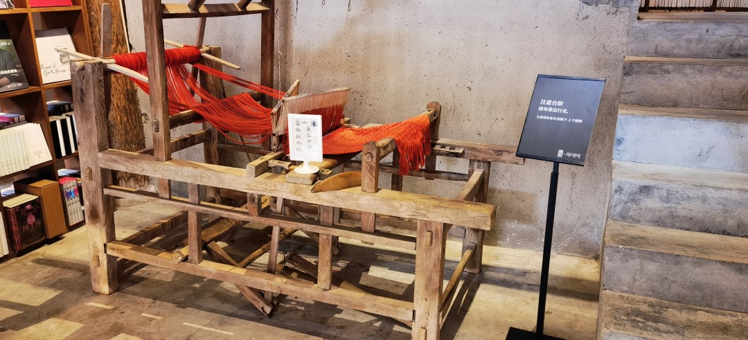 迈进书店,首先映入眼帘的是门口的畲族传统织布机,橙红色的丝线穿梭其中,为这个充满书香的空间增添了几分民俗的韵味。这台从当地旧货市场淘来的织布机,代表着畲族的传统技艺。