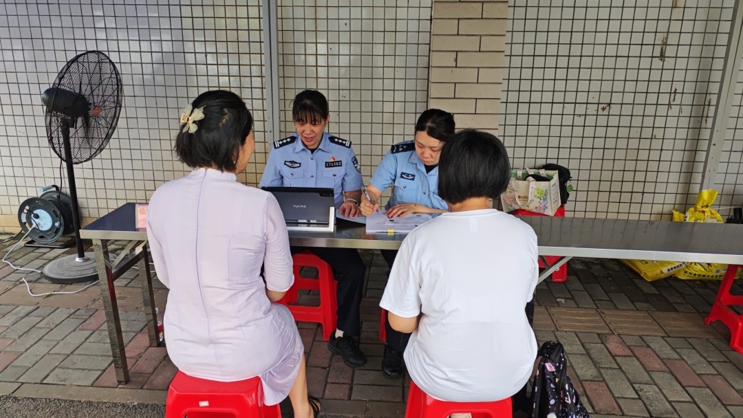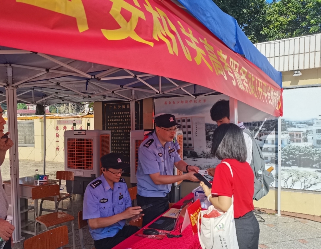 在开平市长师中学考点,一名香港籍考生前来高考服务站咨询用港澳居民居住证是否能参加考试,户籍民警耐心给予解答,表示用港澳居民居住证不影响参加高考,并祝考生高考顺利。