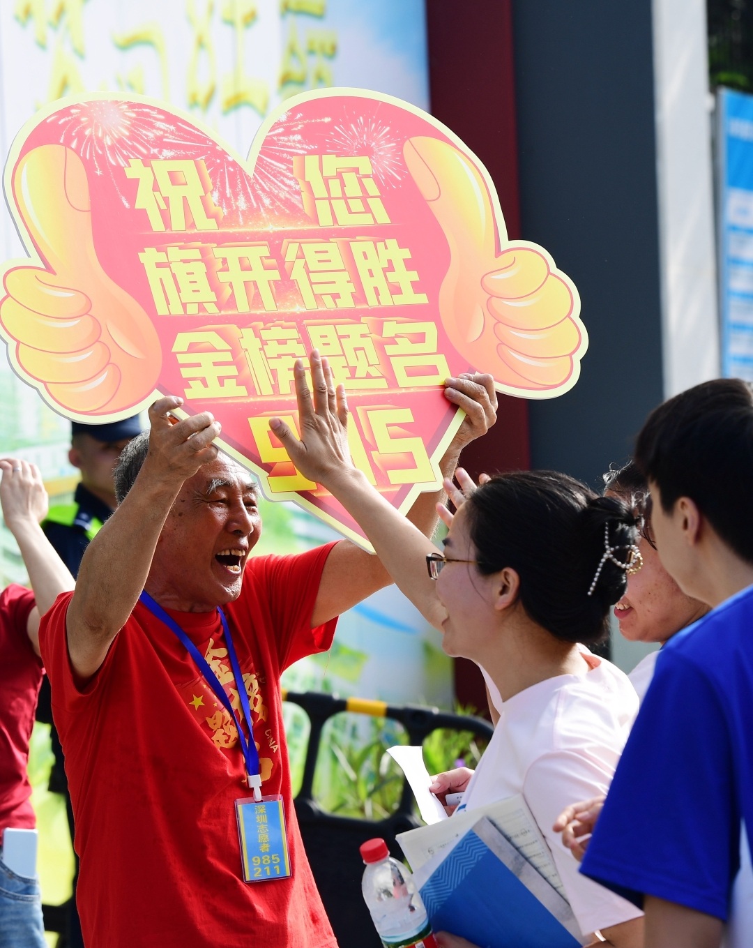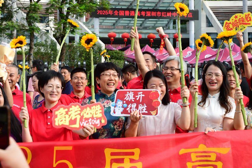 在红岭中学考点送考家长身穿红色旗袍,手举象征一举夺魁的向日葵为考生加油!志愿者高举“旗开得胜”“金榜题名”吸引考生触摸,育才中学考点深圳交警给送考家长送荔枝。祝愿考生开出好成绩!