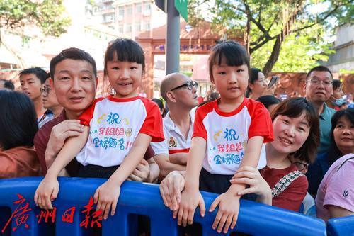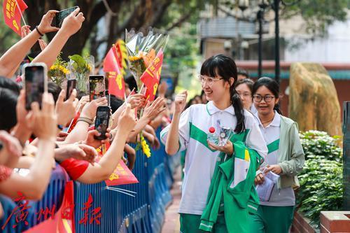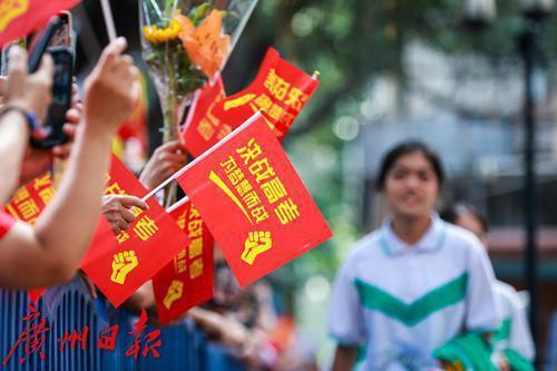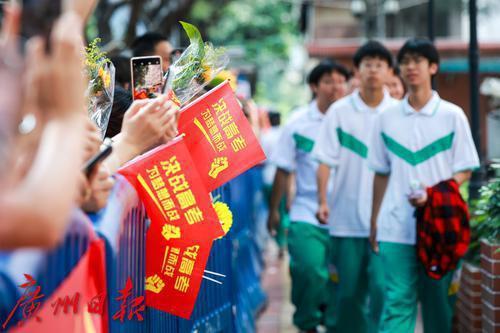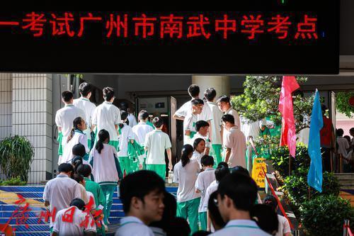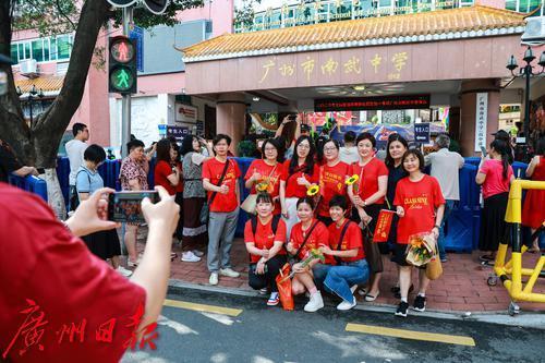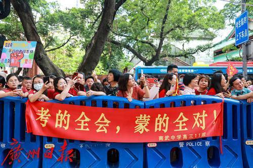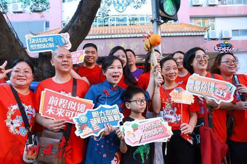 南武中学的家长用粤语谐音祝福考生,他们带来香蕉、耙耙柑、粽子、甘蔗,寓意考生有朝(蕉)一日、金(柑)榜题名、高中(粽)状元、掂过碌蔗!